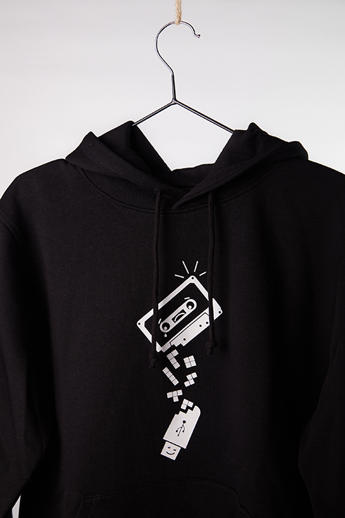El diseño de la sudadera es muy original, pues presenta un cassette descomponiéndose en piezas del tetris y formando posteriormente un pendrive, lo que la hace única y atractiva. El estampado está realizado con tintas al agua, libres de plásticos, lo que garantiza su cuidado con el medio ambiente y la piel de quienes la usan.